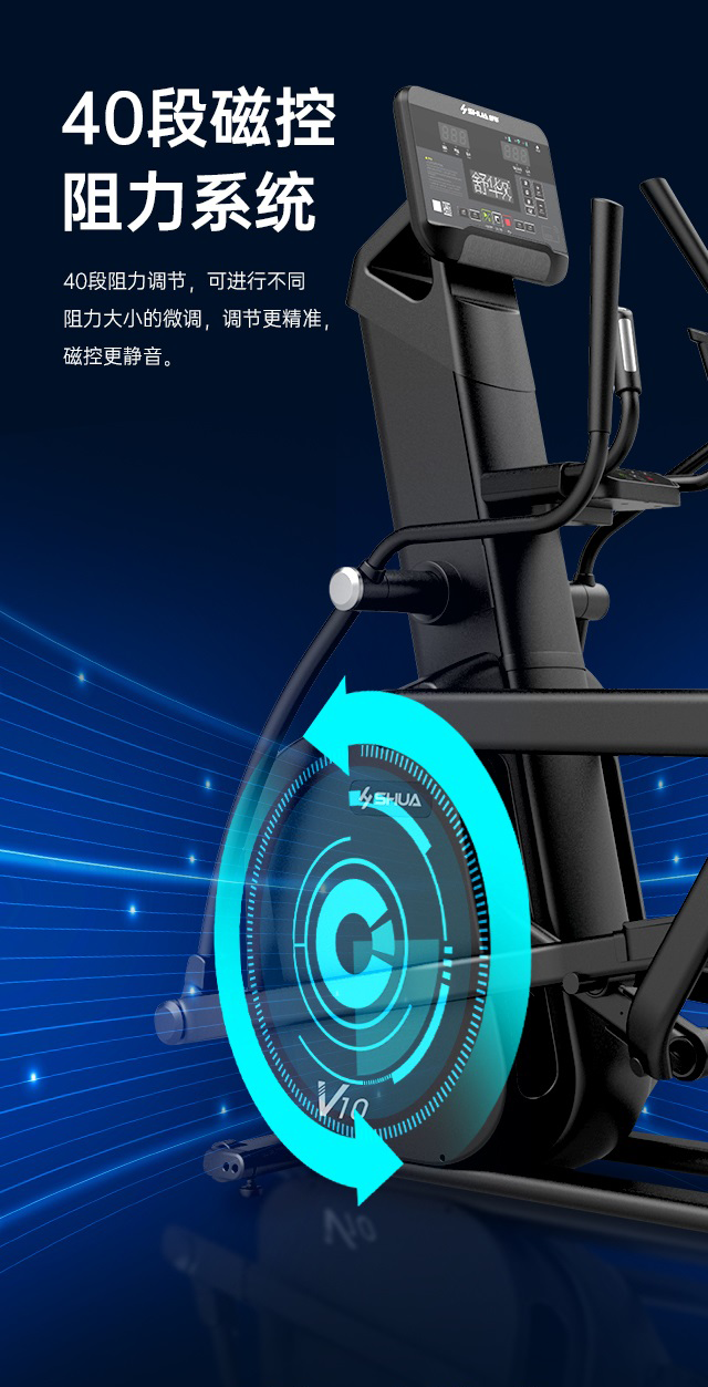 商用椭圆机SH-B9100E(LED版)采用自发电方式,磁控阻力系统的阻力系统,可以设定40段阻力段,最大使用者体重为180kg,踏步跨距可达508mm,适用于大多数人,现在伟德国际1946旗舰店都有这一款椭圆机,欢迎前来体验试机。